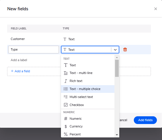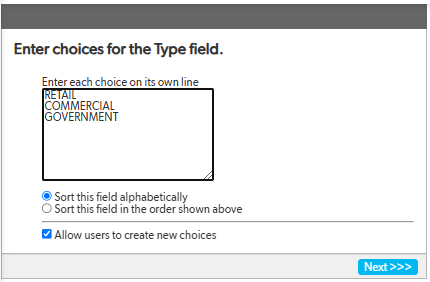 When you add a “Text – multiple choice” or “Multi-select text” field type, you will need to enter the choices for each one.